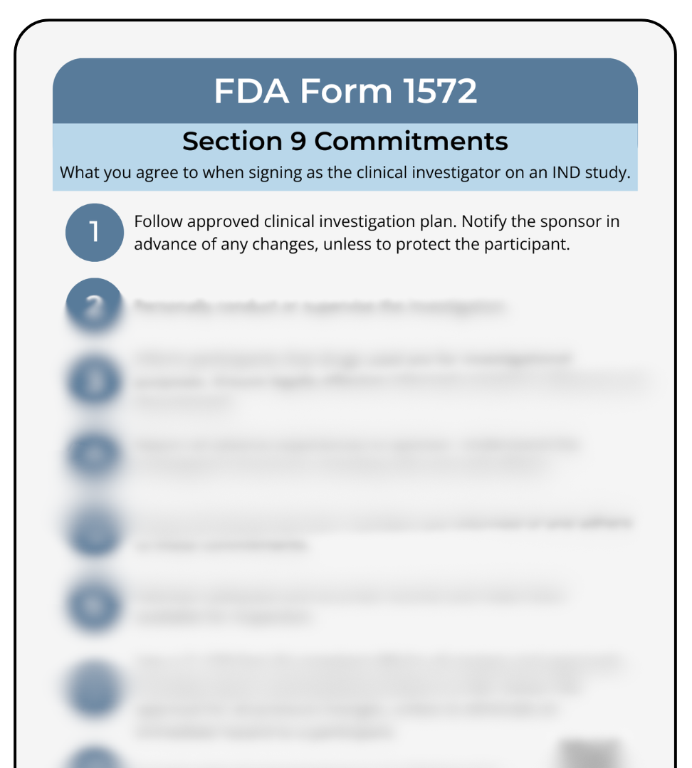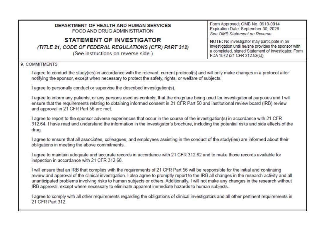 A straightforward reminder of the commitments tied to FDA Form 1572 — easy to reference, easy to share, and ready for real-world study work.