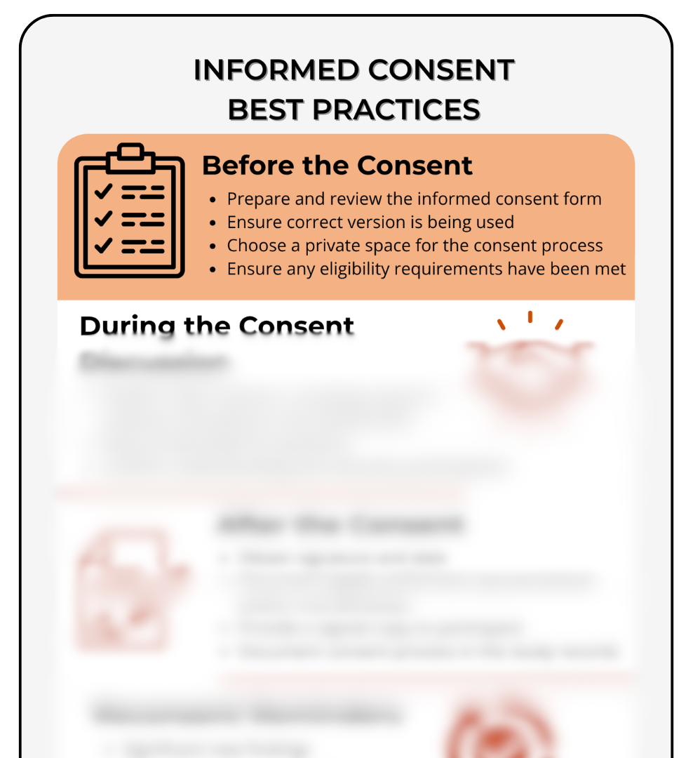 A strong informed consent process doesn’t just check a box — it builds trust, supports participant understanding, and protects your study. This guide walks you through the essential best practices at each stage of consent so you always know what to do and when. From preparing the correct form and choosing a private space, to leading a clear discussion, documenting signatures, and knowing when re-consent is required, everything is laid out in simple, approachable language. Whether you’re training new coordinators, onboarding students, supporting investigators, or refreshing your own skills, this checklist helps you stay organized, compliant, and confident in your consent responsibilities. It’s a great tool for onboarding packets, site binders, or your desk for quick reference whenever you need it.
